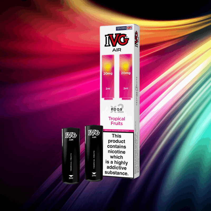 Tropical Fruits - An exquisite blend of exotic fruits that transports you to a tropical paradise with every puff. Designed for use with IVG Air 4 in 1 or IVG Air 2 in 1 rechargeable